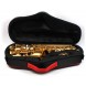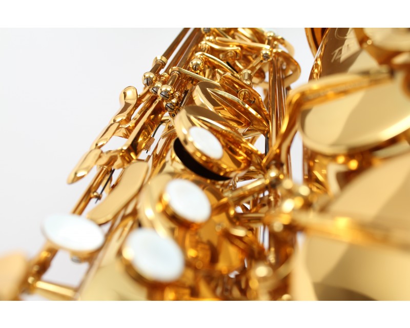 This alto saxophone has a high quality dark gold lacquered body and keys providing a durable finish. Crafted like the Paris Selmer 52 Alto Saxophone, it has tilting G#/Bb spatula keys & Zephyr Fast Action blue steel springs - the outfit includes a plastic (3C) medium closed mouthpiece and cap, a metal ligature, and Professional lightweight padded gig bag molded case with shoulder straps.